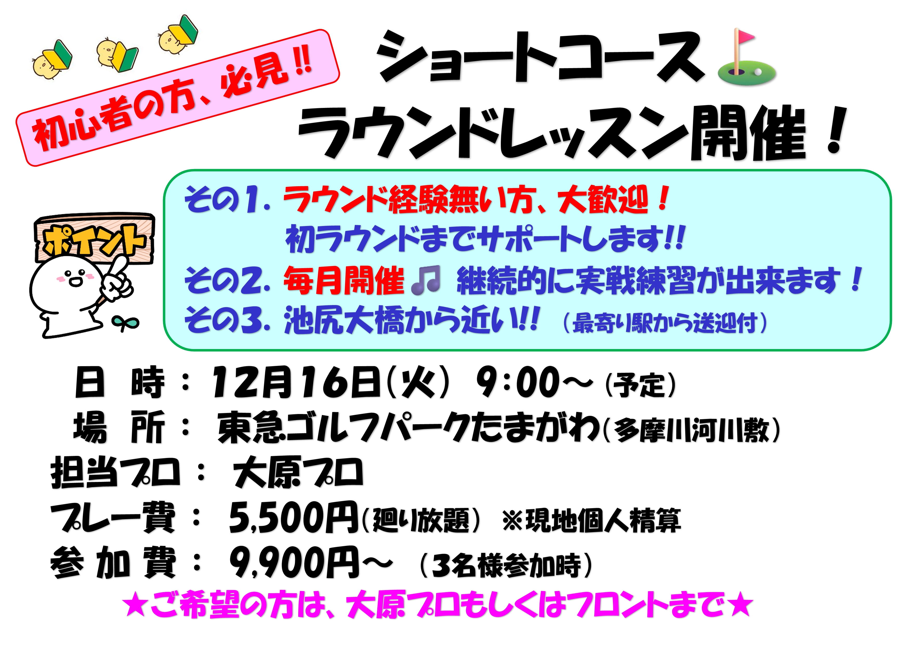 ③12月のラウンドレッスン⛳参加者募集!! 2025/11/16 いつもご利用いただきましてありがとうございます。 この度、大原プロによるショートコースでのラウンドレッスン⛳が決まりました!池尻大橋から近い多摩川河川敷のショートコースです。コース経験のない方でも大歓迎!経験者の方も勿論OK👌ショートゲームの集中練習にいかがですか? 廻り放題なので、体力が続く限り廻れますよ!!笑 ★ご希望の方は、お早めにフロントまで★ 共有:Facebook で共有 (新しいウィンドウで開きます)クリックして Twitter で共有 (新しいウィンドウで開きます)クリックして Google+ で共有 (新しいウィンドウで開きます)