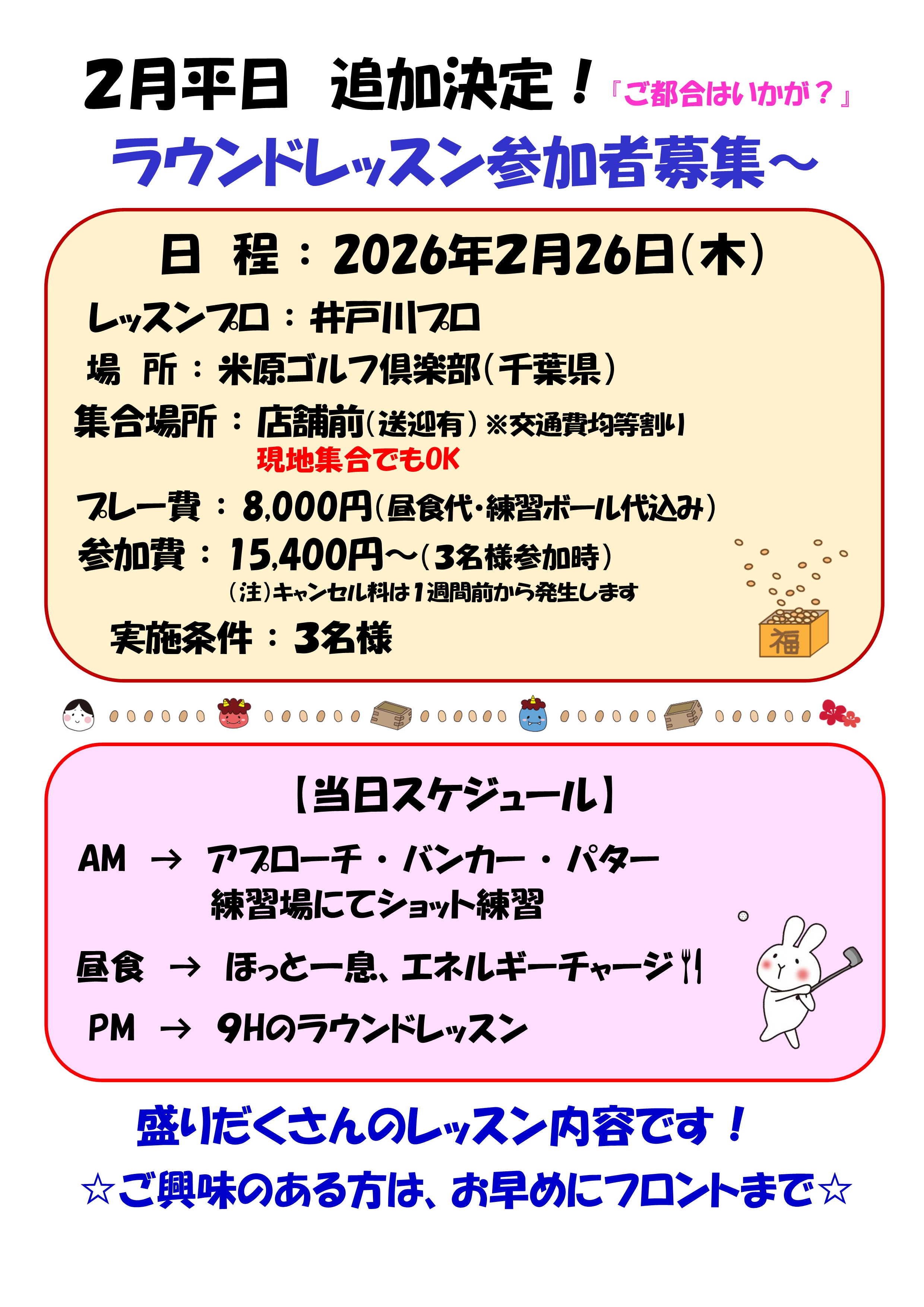 2月の平日ラウンドレッスン⛳追加決定~!!