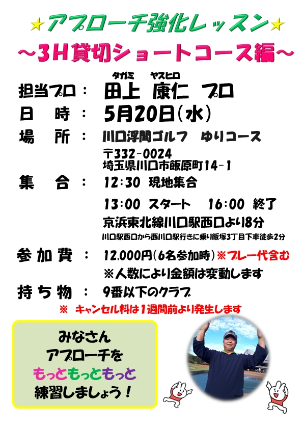 アプローチ強化レッスン(3H貸切)参加者募集! 2026/04/24 いつもご利用いただきましてありがとうございます。 「アプローチに悩んでいませんか?」 この度、そんな皆様のために、ショートコースを貸切りにして【アプローチ強化レッスン】を開催いたします!! 蒲田店のレッスンプロが担当いたします。初心者の方、経験者の方、問いません。 当店舗のスタッフも同行いたしますので、安心してお気軽にご参加下さいませ。 ★ご希望の方は、お早めにフロントまで★ 共有:Facebook で共有 (新しいウィンドウで開きます)クリックして Twitter で共有 (新しいウィンドウで開きます)クリックして Google+ で共有 (新しいウィンドウで開きます)
