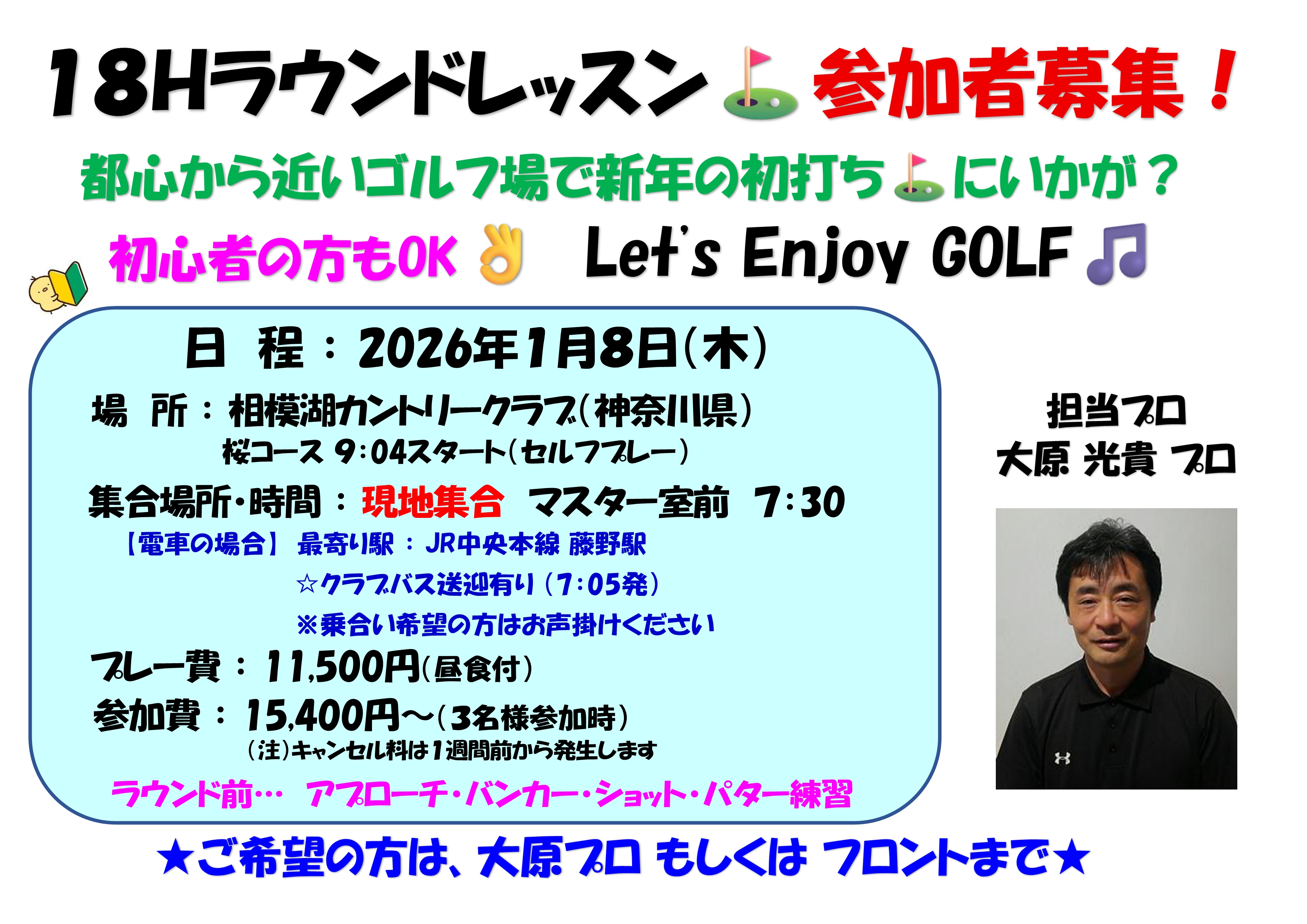 2026年1月のラウンドレッスン⛳参加者募集!! 2025/12/02 いつもご利用いただきましてありがとうございます。 2026年1月の18Hラウンドレッスン⛳参加者募集を開始いたします! 年明け早々ではございますが、1年のスタートとして気持ちよくラウンドしませんか? 皆様からのご参加をお待ちしております!! ★ご希望の方は、お早めにフロントまで★ 共有:Facebook で共有 (新しいウィンドウで開きます)クリックして Twitter で共有 (新しいウィンドウで開きます)クリックして Google+ で共有 (新しいウィンドウで開きます)